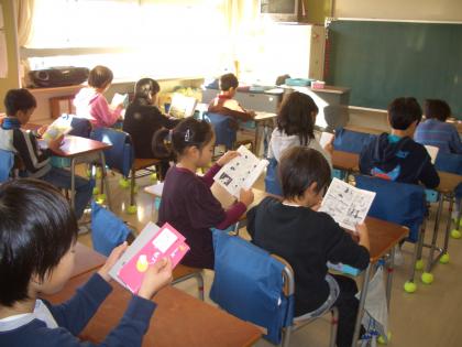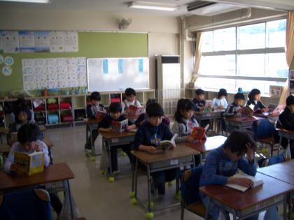 2年生は、「読書タイム」を楽しんでいました。時間になると、一人一人の子どもが、図書室から借りてきた本、学級文庫の本棚や自宅からもってきた本を読み始めていました。低学年の頃から、読書が自然にできるのは、保護者により“読み聞かせ”や担任からの読み聞かせ・・・・雨の日に高学年の図書委員会の児童による“読み聞かせ”等々の取り組みが定着していることも大きいかもしれません。