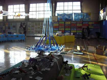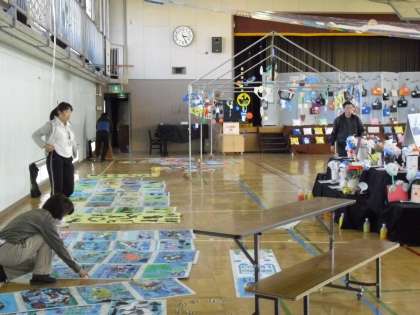 6年生の女子もお手伝い・・・先生も主事さんもみんなで子ども作品をよりよく見えるように・・・