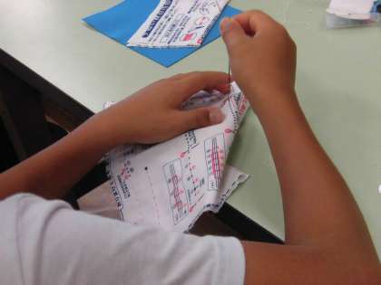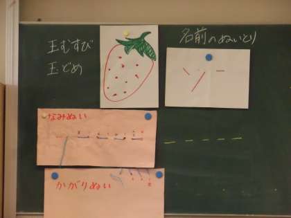 家庭科の学習では、手縫いの練習を行っています。