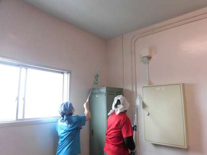 子どもたちが授業中の廊下や階段では、主事さん方が、壁の掃除をしてくださっています。
