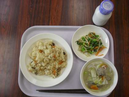 今日の献立は、きのこごはん、牛乳、とびうおのつみれ汁、野菜のごまだれけです。