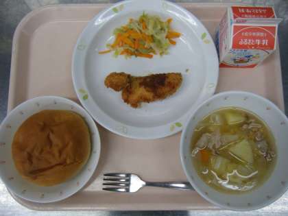 今日の給食は、パン、牛乳、魚のフライ、野菜ソテー、豆入り野菜スープです。