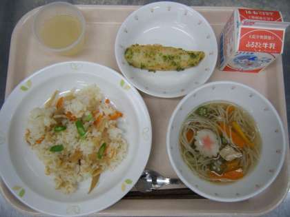 今日の給食は、五目ずし、牛乳、笹かまぼこの磯辺揚げ、七夕汁、りんごゼリーです。
