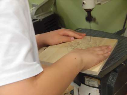 図画工作科の授業では、電動糸のこぎりを使って、慎重に木を切っています。