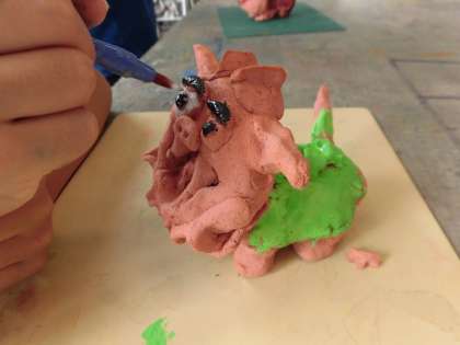 沖縄の守り神のシーサーを、授業では粘土に色を塗って、絵付けする石垣島風に作ります。