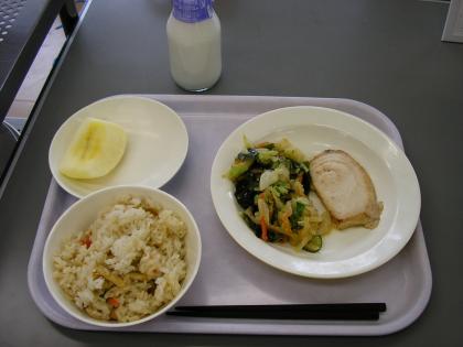 今日の献立は、子ぎつねご飯、魚の照り焼き、和風サラダ、りんごです。子ぎつねご飯には、油揚げが入っていておいしかったです。