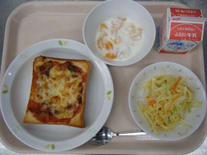 今日の給食は、ピザトースト、牛乳、じゃがいものハニーサラダ、フルーツヨーグルトです。
