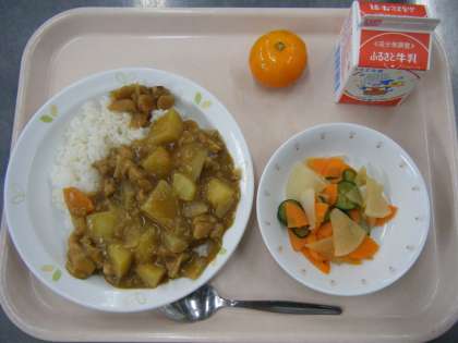 今日の給食は、チキンカレーライス、牛乳、シャキシャキ野菜、くだもの(冷凍みかん)です。