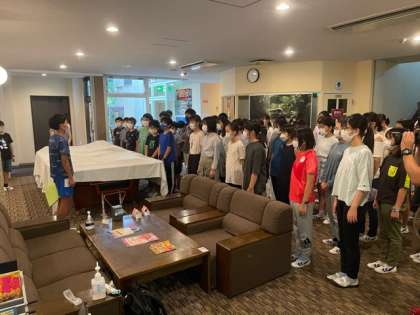 ホテルに到着し、開園式をしています。予定を少し変えて、雨で濡れた服を着替えてからの開園式となりました。
