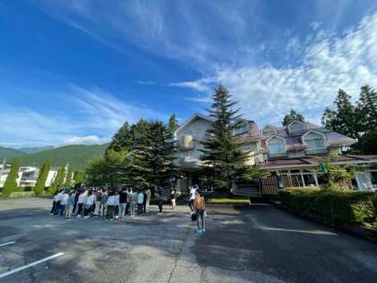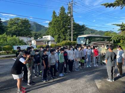 朝の会です。朝から青空です。外に出た子どもたちも気持ちよさそうです。