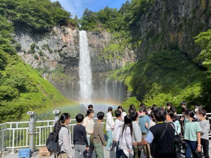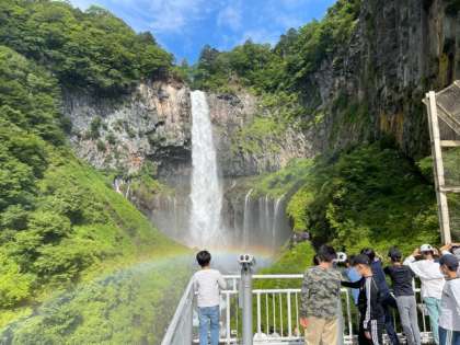 華厳の滝に来ました。昨日の雨のおかげで水量がすごく、虹がでています。