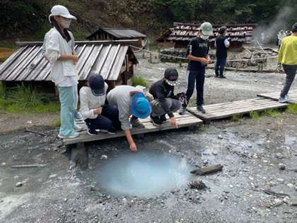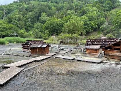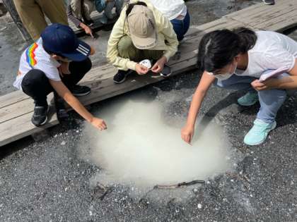 源泉に来ました。硫黄の匂いが立ち込めています。