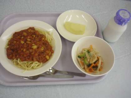 今日の献立は、スパゲティミートソース、牛乳、大根サラダ、くだものです。