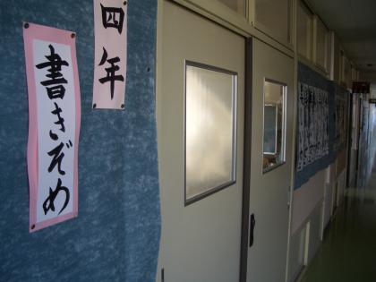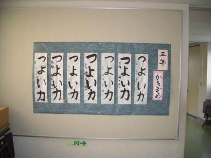 3年生からは、毛筆の書き初めです。左画面は、3年生、「つよい力」です。初めての毛筆の書き初めです。先生の指導をよく聞き、一生懸命に書き上げました。