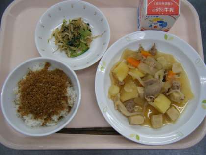 今日の給食は、麦ごはん、牛乳、かつおでんぶ、肉じゃがうま煮、小松菜の海苔あえです。