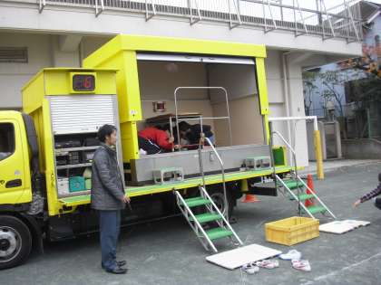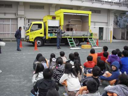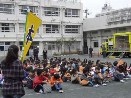 東京に“地震”が来たことを設定に・・・避難訓練を行いました。そのあと、4年生以上の子ども達が起震車体験をしました。頭や身体を机の下に・・・