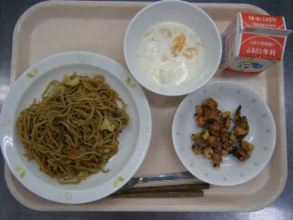 今日の給食は、ソース焼きそば、牛乳、お豆かりんとう、フルーツヨーグルトです。
