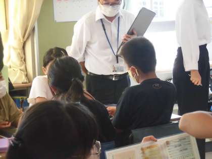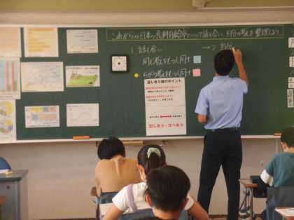 5時間目に5年1組で社会科の校内研究が行われました。