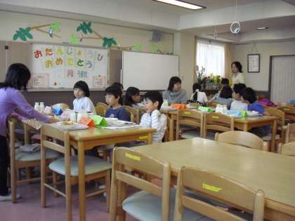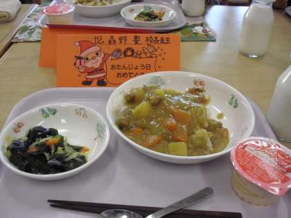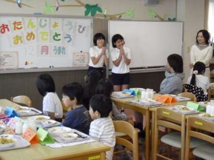 12月生まれの子どもと教職員がレンチルームで、給食を一緒に食べてお祝いをしました。