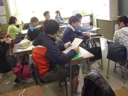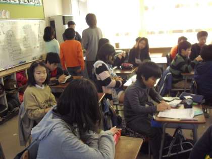 “朝の会の前・・・個別指導”・・・その間、プリントとの見直しをしている子どももいます。