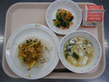 今日の給食は、かきあげ丼、牛乳、野菜のおひたし、みそ汁です。