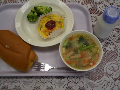 今日のメニューは、パンプキンパン、牛乳、チーズ入り卵やき、白菜と春雨のスープ、ブロッコリーです。