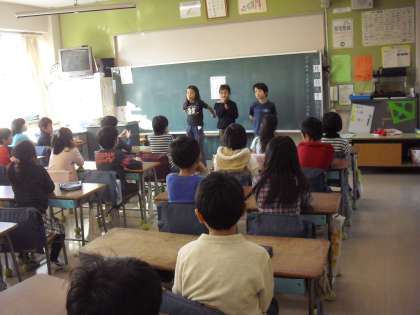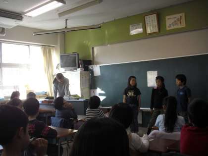 “朝の会・・日直のスピーチ”BOPで遊ぶことを話していました。先生が助言していました。