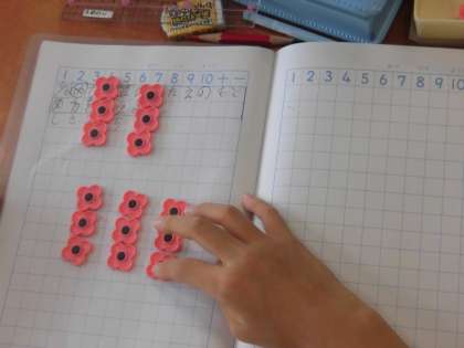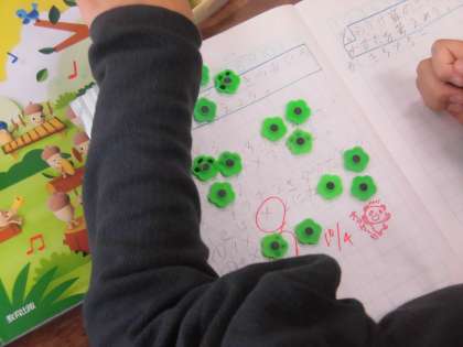 算数科のかけ算の授業では、かけ算の答えをどのようにして求めればよいか、考えました。「3×5」の計算をおはじきを使って分かりやすく説明している子どもたちもいました。