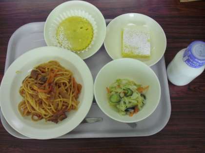 今日の献立は、スバげティナポリタン、牛乳、野菜のドレッシングかけ、南瓜のケーキです。南瓜のケーキは、アレルギー対応を調理員さんがしました。紙カップにあるのがそうです。