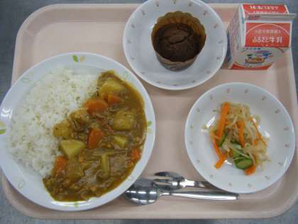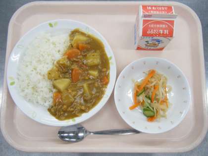 今日の給食は、カレーライス、牛乳、和風サラダです。