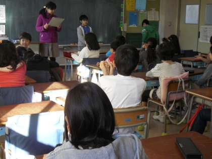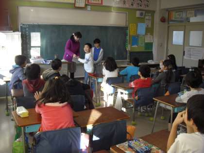 朝の会・・・健康観察・・・係児童が出欠表を先生に渡しているところです。