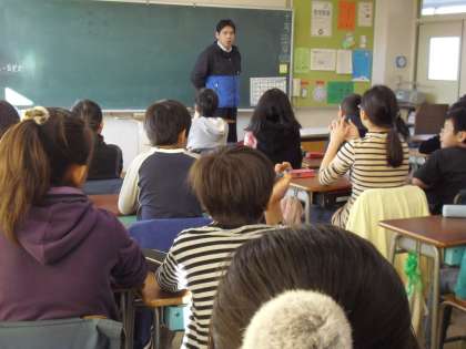 朝の会・・・先生の話・・・・今、体育でバスケットボールを学習しています。ゲーム運び、動き、作戦などもヒントを子どもたちに話していました。