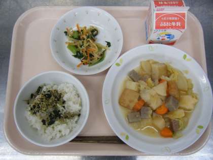 今日の給食は、麦ごはん、牛乳、じゃこのふりかけ、豚肉と大根のうま煮、もやしのカレーじょうゆです。