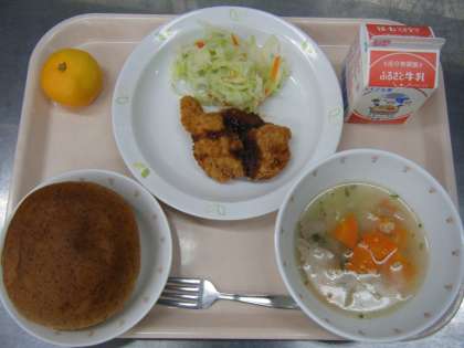 今日の給食は、胚芽パン、牛乳、チキンカツ、ゆで野菜、ABCスープ、みかんです。