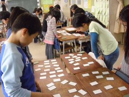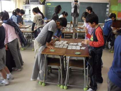 “国語:百人一首”各グループごとに準備して・・・先生がみんなに聞こえるように・