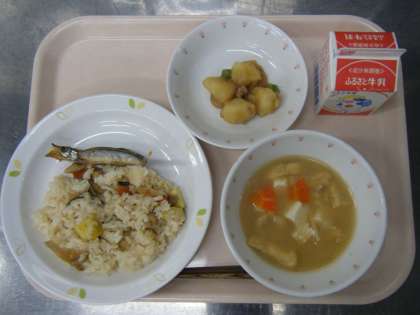 今日の給食は、秋の香りごはん、牛乳、焼きししゃも、じゃが芋の甘辛煮、みそ汁です。
