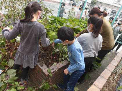 学校の畑のサツマイモのツルを取りました。