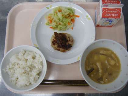 今日の給食は、麦ごはん、牛乳、豆腐入りハンバーグ、添え野菜、みそ汁です。