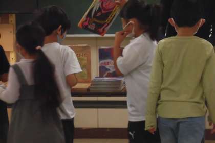 読み聞かせの終わりに実際の本を見せていただき、子どもたちは直接本を手に取りながら感想を述べていました。