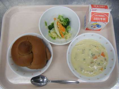 今日の給食は、ココアパン、牛乳、ブロッコリーのサラダ、魚のチャウダーです。