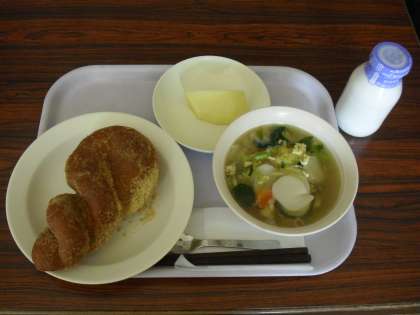 今日の献立は、揚げパン、牛乳、卵入り雑煮、くだものです。今日もアレルギー対応食を調理員さんが作りました。