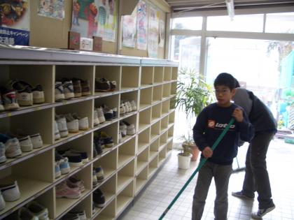6年生の靴箱の清掃風景です。協力してきれいにしています。少人数でもふざけないで、真剣に取り組んでいます。