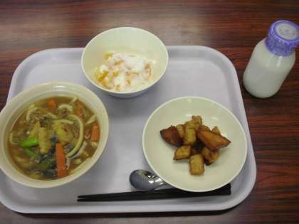 今日の献立は、カレーうどん、牛乳、いかとさつま芋の揚げ煮、フルーツヨーグルトです。