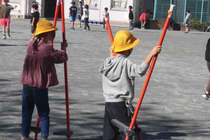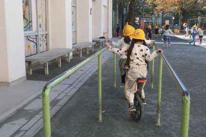 中休みの校庭では、一輪車や竹馬を使って遊んでいます。