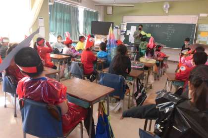 教室いっぱいに様々な海の生き物たちがいます。自分たちで作った小道具を身に付け大喜びです。