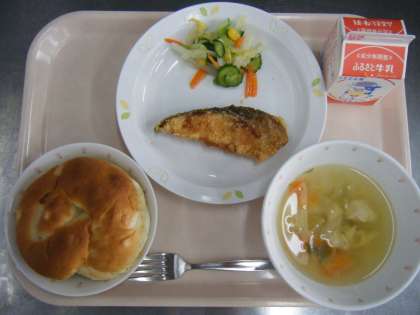 今日の給食は、パインパン、牛乳、鮭のレモンソースかけ、白菜とコーンのサラダ、マカロニスープです。