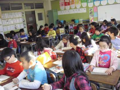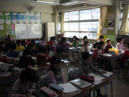 先生が来る前に・・・宿題プリントの答え合わせです。・・・順番に答えて○をつけて