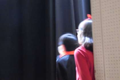 舞台裏では、緊張しながら舞台の様子を見ています。