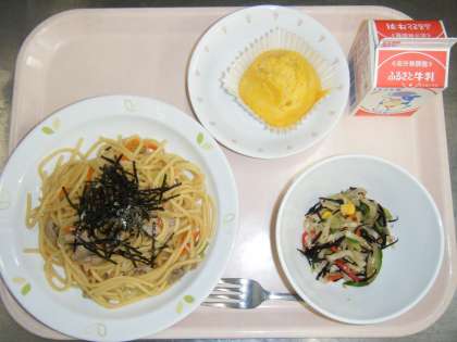 今日の給食は、和風スパゲッティ、牛乳、大根とひじきのサラダ、キャロット蒸しパンです。