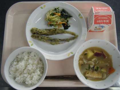今日の給食は、麦ごはん、牛乳、ししゃもの磯辺揚げ、わかめと野菜のごま風味、さつま汁です。